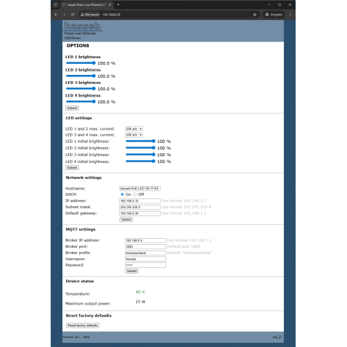 - LED brightness and device settings controllable via MQTT, Modbus/TCP, and HTTP POST API